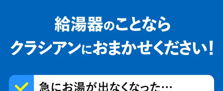 給湯器のことならクラシアンにおまかせください!急にお湯が出なくなった……自然災害の影響でお湯が使えない 異音・異臭がする症状が悪くなる前に・・・クラシアンにご相談ください!